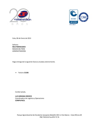 El documento contiene cuatro cartas idénticas de Luz Adriana Orozco, coordinadora de logística y operaciones de COMPUFACIL, entregando la factura 11166 anulada anteriormente a Magda Beltrán, administradora de MULTIMERCADEO.