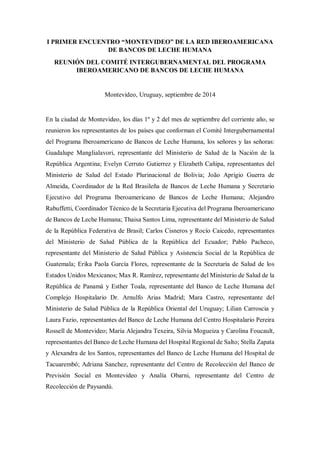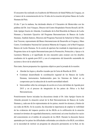 Representantes de países iberoamericanos se reunieron en Montevideo, Uruguay para el Primer Encuentro de la Red Iberoamericana de Bancos de Leche Humana. El objetivo fue abordar los logros y desafíos de la Red, continuar desarrollando la coordinación regional de los bancos de leche, e intercambiar estrategias de acción. Se discutió la importancia de ampliar la visibilidad de los impactos positivos de los bancos de leche y localizar vacíos de conocimiento. Los países apuntaron dificultades como la necesidad