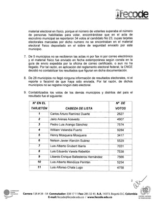 El acta final de escrutinios de la Comisión Nacional de Garantías Electorales documenta el proceso de escrutinio de las elecciones para el Comité Ejecutivo de la Federación Colombiana de Trabajadores de la Educación, realizado el 7 de junio de 2013. Se detalla la verificación de actas, el conteo de votos y las irregularidades encontradas en varios municipios, así como los resultados finales que conforman el nuevo comité para el período 2013-2017. El acta fue cerrada y se anunció su publicación en la página web de FECODE.