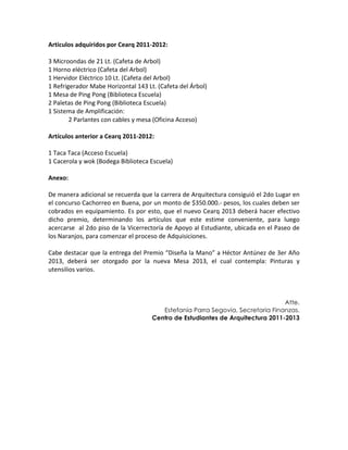 El Centro de Estudiantes de Arquitectura 2011-2013 entregó fondos de $75,820 a la nueva mesa directiva 2013. Durante su período, el CEARQ 2011-2013 invirtió fondos de $70,000 en diversas actividades estudiantiles y adquirió equipamiento para la cafetería de la escuela. Adicionalmente, el CEARQ 2011-2013 consiguió $350,000 en un concurso que deberán ser cobrados en equipamiento por la nueva mesa directiva.