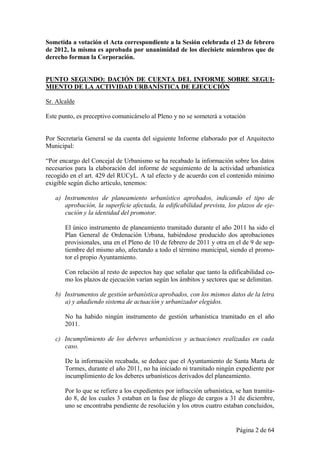 1) Se aprobó el acta de la sesión anterior y se dio cuenta de varios informes, entre ellos el informe de seguimiento de la actividad urbanística.