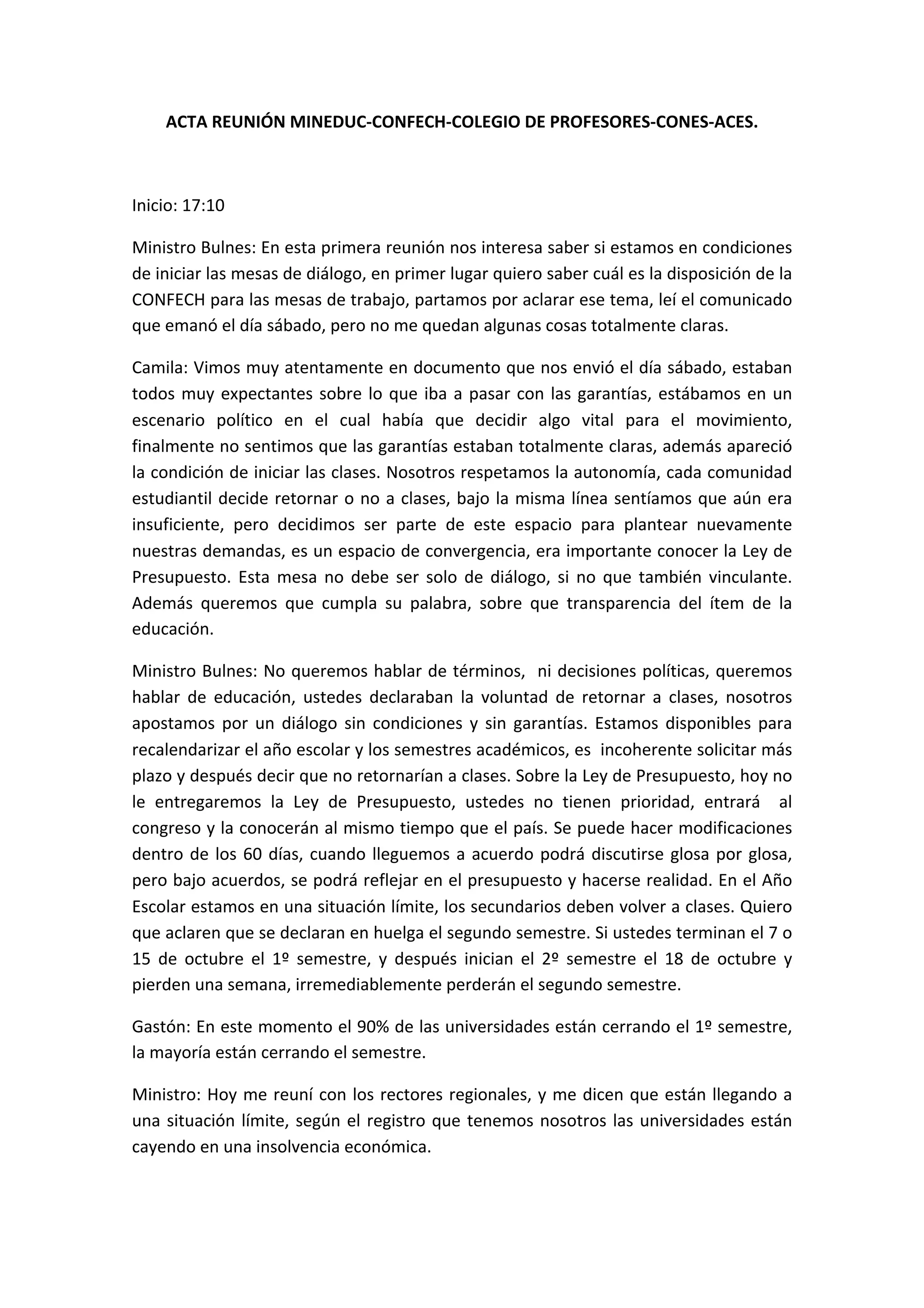 Este documento contiene el acta de una reunión entre representantes del Ministerio de Educación de Chile (MINEDUC), la Confederación de Estudiantes de Chile (CONFECH), el Colegio de Profesores, la Confederación Nacional de Estudiantes Secundarios (CONES) y la Asociación de Centros de Alumnos de la Educación Superior (ACES). En la reunión, el Ministro Bulnes busca aclarar la disposición de CONFECH para iniciar mesas de diálogo, mientras que los representantes estudiantiles insisten en que primero deben resol