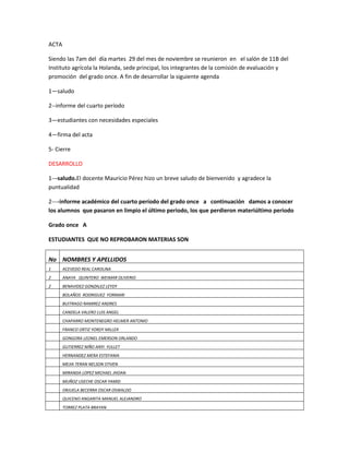 El acta resume la reunión de la comisión de evaluación y promoción del grado 11 del Instituto Agrícola La Holanda. Reporta los estudiantes que aprobaron y reprobó materias en el último periodo, así como los que tienen la opción de nivelar una o dos materias para diciembre o enero.