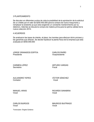 La reunión extraordinaria del comité directivo discutió la posibilidad de aprobar un préstamo de $250 millones para comprar nueva maquinaria y materia prima, decidiendo hipotecar la planta física valorada en $450 millones como garantía.