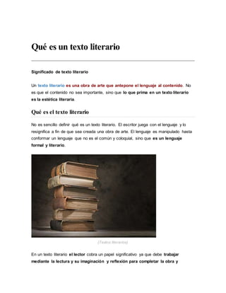 El documento define qué es un texto literario y describe sus características principales. Un texto literario antepone el lenguaje al contenido y manipula el lenguaje para crear una obra de arte. Los textos literarios se basan en la narración, descripción y diálogo y tienen como objetivo ser una obra de arte más que transmitir información de manera utilitaria. El lector juega un papel importante en la interpretación de un texto literario.