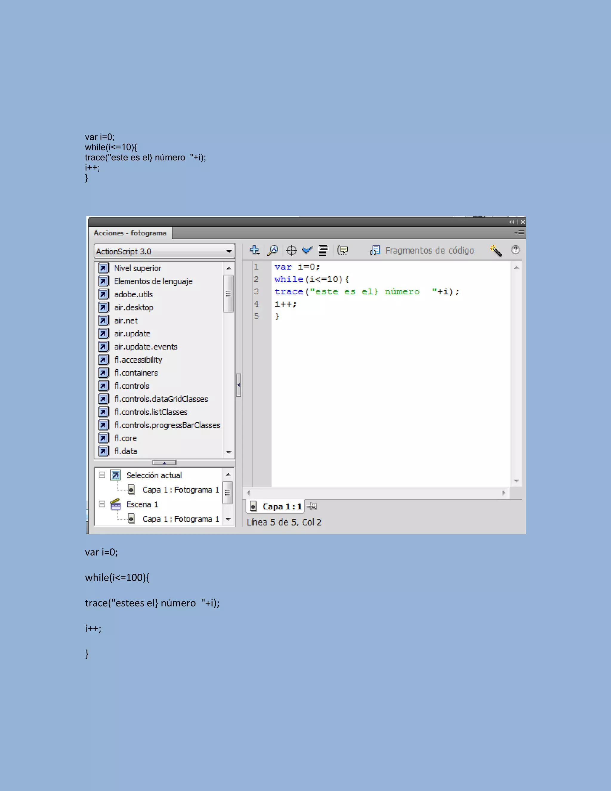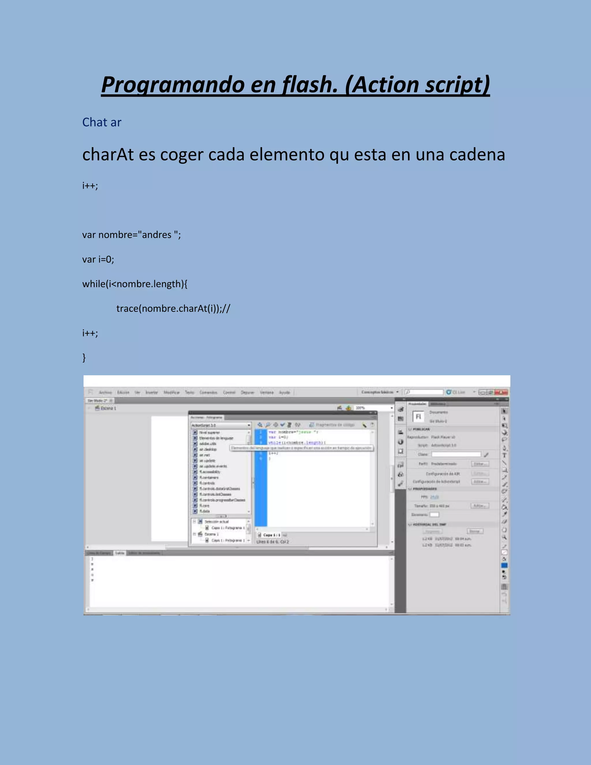 El documento describe varios ejemplos de bucles (while, do-while, for) en ActionScript para iterar sobre cadenas, arrays y números. Incluye ejemplos de impresión de caracteres individuales de una cadena, números pares e impares, y números primos almacenados en arrays. También muestra cómo iterar sobre las propiedades de un objeto usando un bucle for-in.