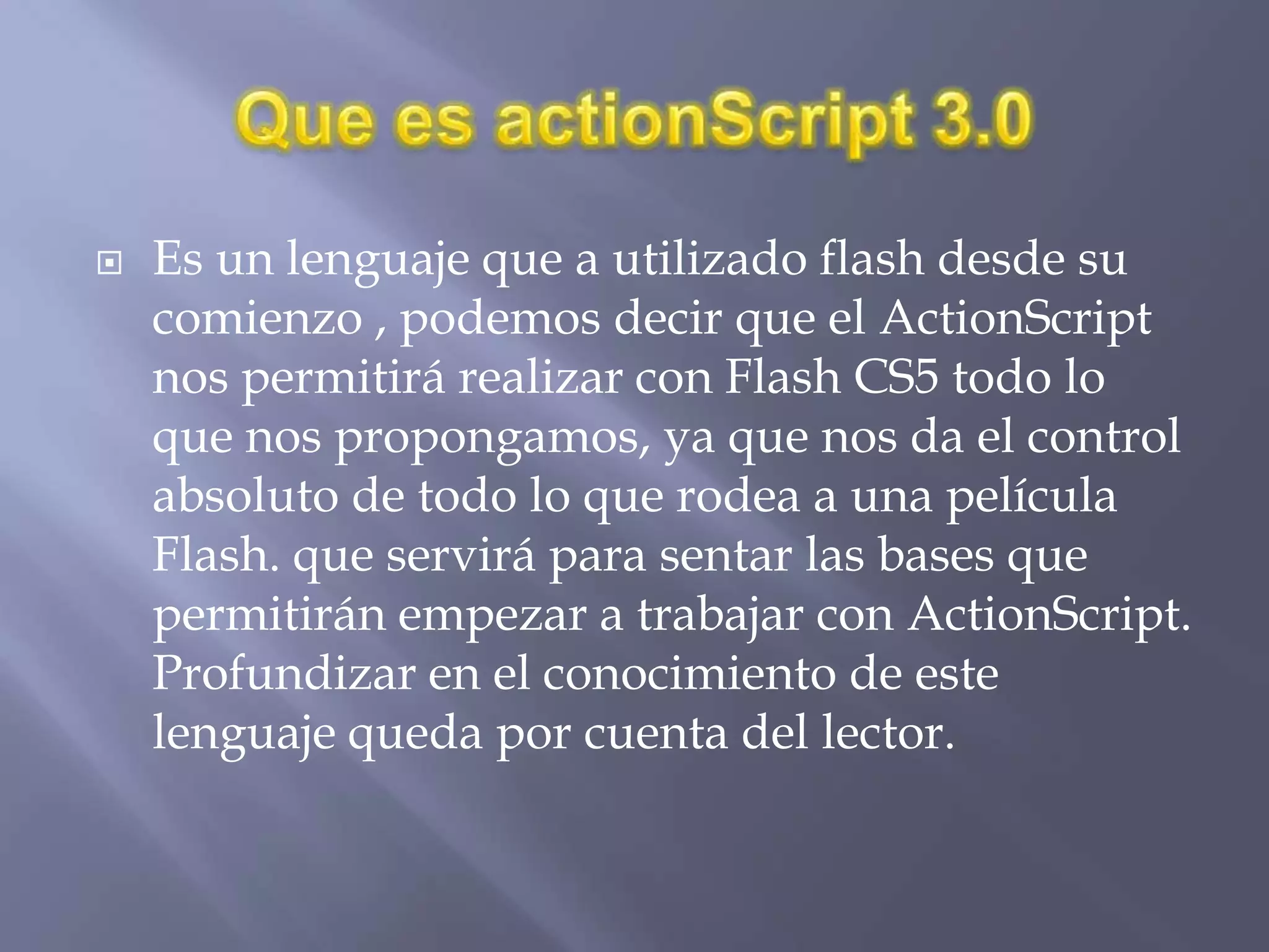 El documento describe el lenguaje de programación ActionScript y su uso en Adobe Flash. ActionScript permite controlar completamente las películas Flash y es similar a otros lenguajes como JavaScript. La versión más reciente, ActionScript 3, es orientada a objetos y más potente que versiones anteriores. El documento también explica cómo crear botones interactivos en Flash usando código ActionScript y controladores de eventos como click del mouse.