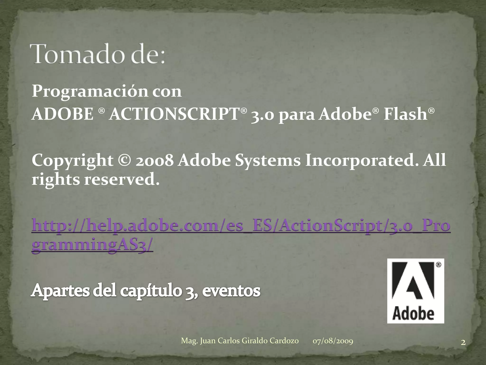 Este documento resume conceptos clave sobre la gestión de eventos en ActionScript 3.0. Explica que un evento ocurre en un objeto específico, como un botón o un objeto Loader, y que es importante identificar el tipo de evento, como un clic o la carga de una imagen. También describe que la gestión de eventos implica definir una respuesta adecuada cuando ocurra el evento.