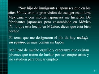 El documento resume cuatro aspectos importantes de la cultura empresarial japonesa: la educación, la actitud hacia la naturaleza, la religión y la actitud hacia la vida. Explica que la educación japonesa enfatiza valores como la honestidad y la puntualidad. También destaca que los japoneses tienen un gran respeto por la naturaleza y que su religión Shinto se enfoca en ofrecer en lugar de pedir. Finalmente, señala que los japoneses tienen una mentalidad de superación personal y de dar lo mejor de sí mismos en