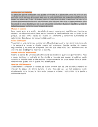 El documento describe cómo cultivar una actitud positiva a través de 10 reglas: relajarse y respirar profundamente, hacer lo que piensas, aprender a ver el lado positivo de las cosas, evitar las comparaciones, vivir el presente, olvidarse de los detalles, mover el cuerpo, cuidar la imagen, prestar atención a los demás y dormir plácidamente. Siguiendo estas reglas se puede transformar en una persona más positiva y creativa para enfrentar mejor los problemas de la vida.