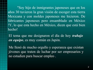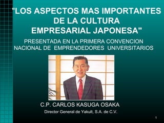 El documento presenta un resumen de la conferencia de C.P. Carlos Kasuga Osaka, director general de Yakult, S.A. de C.V., sobre los aspectos más importantes de la cultura empresarial japonesa. Kasuga destaca cuatro diferencias clave entre Japón y México: la educación, la actitud hacia la naturaleza, la religión y la actitud hacia la vida. Explica que en Japón se enfatiza la educación formativa, el respeto por la naturaleza, el shintoísmo promueve ofrecimientos en lugar de petic