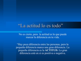 Este documento describe la importancia de la actitud y cómo puede marcar la diferencia en la vida de una persona. Define la actitud como un sentimiento interno que se expresa a través de la conducta externa y discute factores como la personalidad, el ambiente y las creencias que influyen en la actitud de una persona. También destaca que aunque la actitud es importante, no puede sustituir la aptitud, la experiencia o el crecimiento personal necesarios para tener éxito. Finalmente, analiza cómo la perspectiva con la que se enfrentan los problemas está marcada por la
