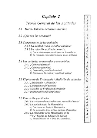 El documento presenta una discusión sobre la teoría general de las actitudes. Explica que el estudio de las actitudes es útil para comprender la conducta humana y analiza diferentes enfoques del desarrollo moral como el constructivismo. También describe los componentes de las actitudes, cómo se forman y cambian, y métodos para evaluarlas. Finalmente, discute el papel de la educación en la formación de actitudes y valores.