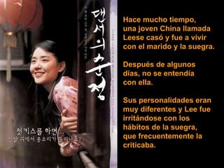 Este documento narra la historia de una joven llamada Leese que se casó y fue a vivir con su suegra. Al principio discutían mucho debido a sus diferentes personalidades, pero Leese decidió envenenar lentamente a su suegra siguiendo el consejo de un amigo. Sin embargo, con el tiempo Leese cambió su actitud, empezó a tratar a su suegra con amabilidad y cariño, y terminó queriéndola como una madre.