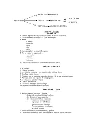 El documento habla sobre las actitudes hacia los exámenes. Explica que los exámenes son instrumentos de evaluación comunes en la educación, pero que causan controversia. Los estudiantes reaccionan de diferentes maneras ante los exámenes, como con ansiedad o tranquilidad. Sin embargo, es mejor tomar una actitud positiva, prepararse bien para los exámenes, y no verlos como un fin sino como una forma de aprender. La sesión de tutoría tiene como objetivo enseñar estrategias para prepararse para los exámenes y controlar los nervios.