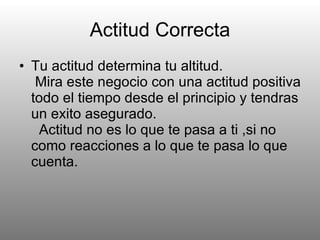 Este documento describe diferentes actitudes positivas que conducen al éxito, incluyendo la actitud del estudiante aprovechado que aprende todo lo posible, la actitud del campeón que construye su historia de éxito desde el principio, y la actitud del ganador que siempre cree que va a ganar y no piensa en la derrota.