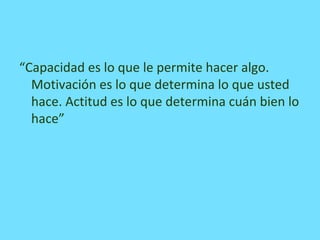 El documento habla sobre la importancia de la actitud y cómo esta determina los resultados. Explica que la actitud es como el indicador de altitud de un avión, ya que determina si se está ascendiendo o descendiendo. También menciona que la actitud afecta las relaciones con otras personas y puede convertir problemas en oportunidades. En general, resalta que tener una actitud positiva es clave para el éxito.