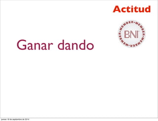 El documento habla sobre la actitud de ganar dando y la tolerancia frente a la frustración. Relata la historia de Alejandro Magno y un mendigo llamado Bianco donde Alejandro le ofrece gobernar una ciudad en lugar de sólo darle de comer. Luego destaca la importancia de dar referencias de calidad a otros para ganar en los negocios.