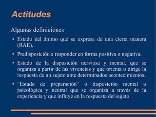 Este documento define las actitudes y describe sus componentes, formación y manifestaciones. Explica que las actitudes son estados mentales que predisponen a responder positiva o negativamente, y que se forman a través de la experiencia. Incluye teorías como la búsqueda de consistencia cognitiva y la disonancia cognitiva. Finalmente, analiza cómo las actitudes afectan la satisfacción laboral, participación y compromiso en el trabajo.