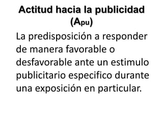 Este documento describe los conceptos de actitud hacia la publicidad y sus determinantes. Explica que la actitud hacia la publicidad se refiere a la predisposición a responder de manera favorable o desfavorable a un estímulo publicitario específico. Identifica algunos factores que influyen en la actitud hacia la publicidad como el contexto en que aparece el anuncio y las dimensiones emocionales. Además, describe tres niveles de compromiso hacia una actitud: conformidad, identificación e internalización.