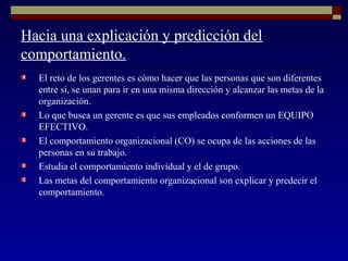 Este documento resume los principales conceptos de comportamiento organizacional como actitudes, personalidad, percepción y aprendizaje. Explica que las actitudes se componen de componentes cognitivos, afectivos y de comportamiento, y que la teoría de la disonancia cognitiva explica cómo las personas reducen la inconsistencia entre sus actitudes y comportamiento. También describe cómo la personalidad, percepción y aprendizaje influyen en el comportamiento individual y de grupo en las organizaciones.