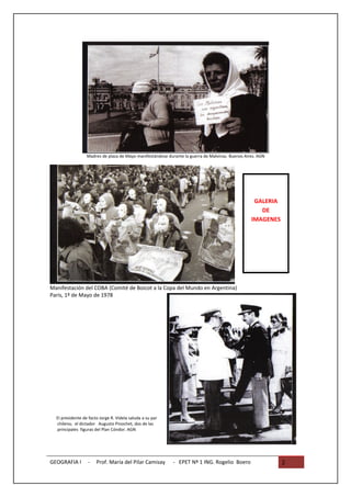 Este documento presenta un resumen de cinco preguntas sobre la última dictadura militar en Argentina que serán analizadas en clase. Las preguntas se refieren a la Doctrina de Seguridad Nacional, las relaciones con otras dictaduras latinoamericanas como parte del Plan Cóndor, y cómo fue vista la dictadura en el exterior y el papel de los exiliados. También incluye una pregunta sobre la guerra de las Malvinas y su vínculo con la dictadura. El documento propone actividades para que los estudiantes investiguen más sobre estos