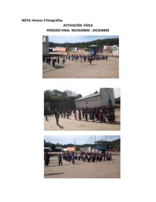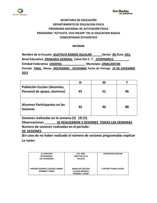 Este documento presenta un informe del programa "Activate, Vive Mejor" en la Escuela Primaria General Gustavo Ramos Aguilar en Chiapas, México. Reporta que la población escolar total es de 96 personas, de las cuales 88 alumnos participaron en las 20 sesiones de activación física realizadas durante noviembre y diciembre. El profesor responsable del programa informa que se llevaron a cabo 3 sesiones cada semana.