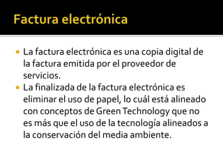 La factura electrónica es una copia digital de la factura emitida por el proveedor que elimina el uso de papel. Google Wallet y Passbook de Apple permiten realizar pagos móviles mediante el registro de tarjetas de crédito o la compra de créditos para establecimientos. Las tarjetas inteligentes almacenan información y autorizan servicios al insertarse en puntos de acceso.