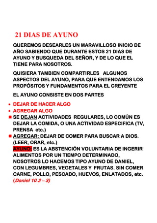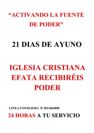 Este documento describe un ayuno de 21 días organizado por la Iglesia Cristiana Efata Recibiréis Poder. El ayuno tiene como objetivo activar la fuente de poder de Dios a través de la oración y el ayuno. Incluye información sobre los beneficios espirituales y físicos del ayuno, así como las pautas para el ayuno de 21 días con una dieta basada en vegetales, frutas y legumbres. También enumera los propósitos generales para el ayuno y la iglesia en el nuevo año.