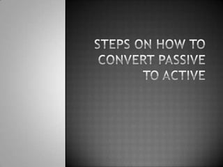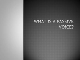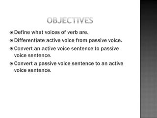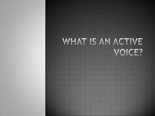 This document defines and differentiates between the active and passive voices. It states that the active voice is more common and has the subject performing the action on the object. The passive voice has the object as the subject receiving the action. It provides examples of converting between active and passive sentences by changing which element is the subject and object.