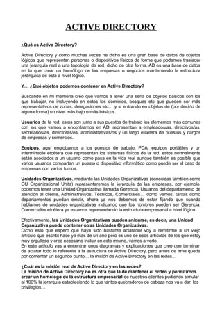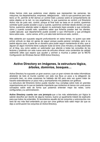 Active Directory es una base de datos que representa la estructura jerárquica de una organización de forma lógica en la red. Contiene objetos como usuarios, equipos y unidades organizativas que simulan la estructura empresarial. Los objetos se pueden anidar entre sí y se pueden agrupar en dominios, árboles y bosques para permitir el control de accesos y privilegios en la red. Los comandos dsquery y dsget permiten consultar y obtener propiedades de los objetos en Active Directory.
