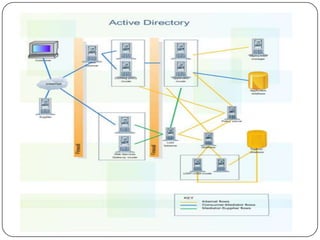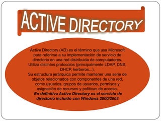Este documento describe Active Directory, el servicio de directorio incluido con Windows que permite mantener una serie de objetos relacionados con componentes de una red de forma jerárquica. Explica que Active Directory utiliza protocolos como LDAP, DNS y Kerberos para autenticar usuarios y asignar recursos de forma segura en una red. También describe la estructura de dominios, subdominios y bosques de Active Directory y cómo esto permite compartir recursos de forma escalable en una red.