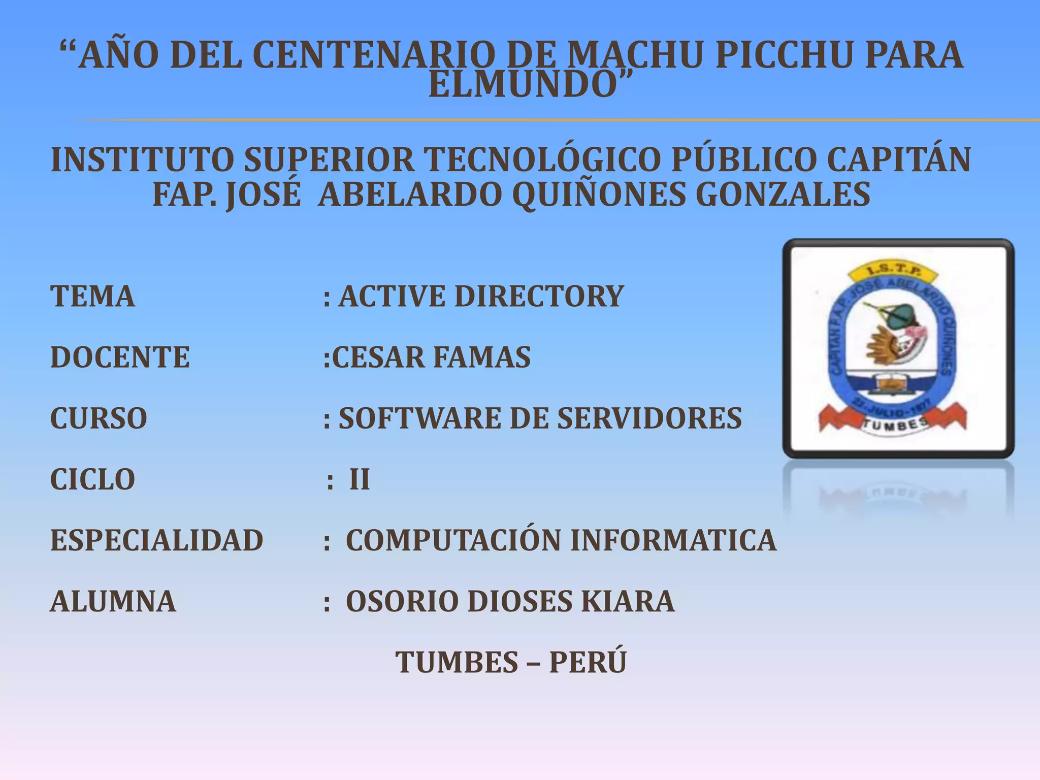 Este documento proporciona información sobre Active Directory. Active Directory es una base de datos centralizada que almacena información de red como usuarios, grupos, equipos y otros objetos de red. Utiliza una estructura jerárquica de dominios y subdominios para organizar los objetos. Los administradores pueden establecer políticas y aplicar configuraciones a los objetos de la red a través de Active Directory.