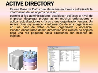 Este documento proporciona información sobre Active Directory. Active Directory es una base de datos centralizada que almacena información de red como usuarios, grupos, equipos y otros objetos de red. Utiliza una estructura jerárquica de dominios y subdominios para organizar los objetos. Los administradores pueden establecer políticas y aplicar configuraciones a los objetos de la red a través de Active Directory.
