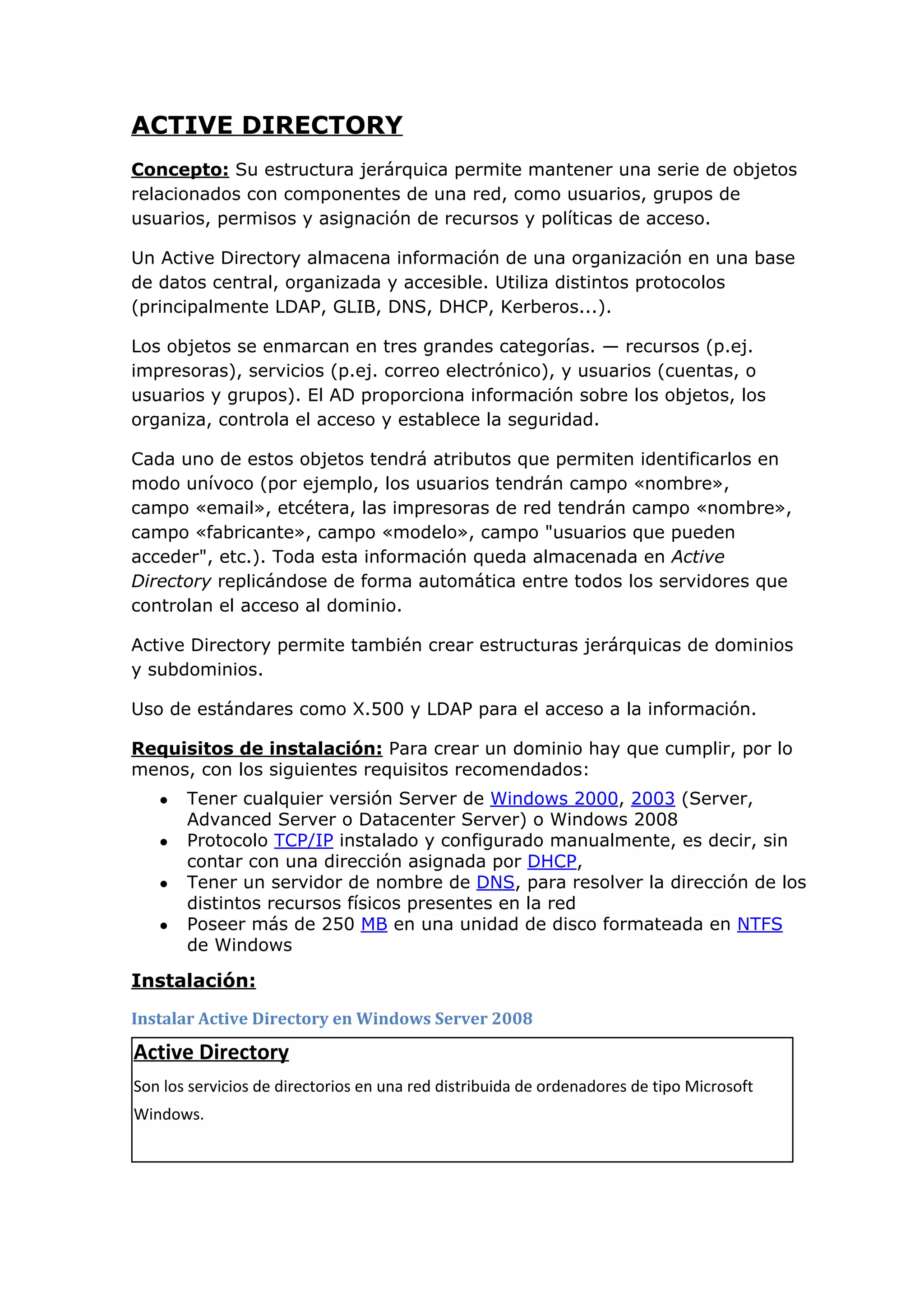 Active Directory permite almacenar y organizar información de una organización en una base de datos central. Utiliza una estructura jerárquica para mantener objetos como usuarios, grupos, permisos y asignación de recursos. Los objetos se agrupan en categorías como recursos, servicios y usuarios, y cada objeto tiene atributos que permiten identificarlo de manera única. Active Directory también permite crear dominios y subdominios jerárquicos.