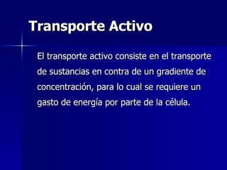 El transporte activo consiste en el movimiento de sustancias contra un gradiente de concentración mediante proteínas de transporte ubicadas en la membrana que requieren energía. Un ejemplo clave es la bomba sodio-potasio que bombea sodio hacia fuera y potasio hacia adentro de la célula. La endocitosis es el proceso por el cual las células incorporan moléculas grandes a través de vesículas, mientras que la exocitosis es la expulsión de sustancias a través de la fusión de vesí