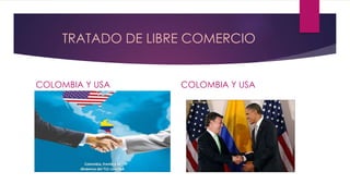 El documento habla sobre el tratado de libre comercio entre Colombia y Estados Unidos. Explica que un tratado de libre comercio consiste en un acuerdo para ampliar el mercado de bienes y servicios entre países mediante la eliminación o reducción de aranceles. El presidente Obama y el presidente Santos están tratando de contribuir a la pronta firma del tratado de libre comercio entre Colombia y Estados Unidos. Además, enumera algunos de los objetivos principales de un tratado de libre comercio como eliminar barreras comerciales y promover la