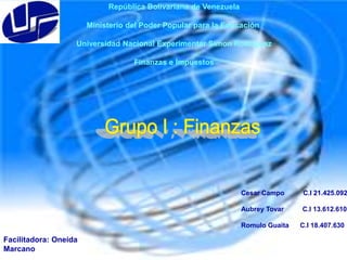 El documento contiene registros de varios grupos de estudiantes que participaron en actividades sobre finanzas e impuestos en la Universidad Nacional Experimentar Simon Rodriguez en Venezuela. Cada registro incluye los nombres e identificaciones de los integrantes del grupo, la facilitadora Oneida Marcano, y secciones para la dinámica de la exposición y la reflexión.