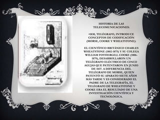 El documento resume la historia de las telecomunicaciones desde el telégrafo en 1830 hasta el desarrollo de las redes digitales en la década de 1980. Algunos hitos clave incluyen el telégrafo de Morse en 1837, el telégrafo múltiple de Baudot en 1874, el teléfono de Bell en 1875, el teletipo en 1910 y el desarrollo de las redes de computadoras y protocolos como ARPANET y TCP/IP en la década de 1970. El documento también cubre la consolidación de la teleinformática y las primer