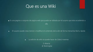 Las wikis se originaron en la comunidad de patrones de diseño cuyos miembros las utilizaron para escribir patrones de programación. Ward Cunningham, quien inventó el término wiki y produjo la primera implementación de un servidor wikiwiki para el repositorio de patrones de Portland. Las wikis son páginas web que pueden ser editadas de forma interactiva y fácil por cualquier usuario.