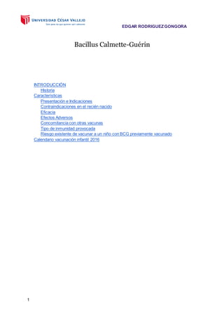 Este documento resume la vacuna BCG contra la tuberculosis. Explica que la vacuna BCG se prepara a partir de un bacilo atenuado y se aplica a recién nacidos para prevenir la tuberculosis. También describe las contraindicaciones, eficacia, efectos adversos, concomitancia con otras vacunas e inmunidad provocada por la vacuna BCG. No hay riesgo en vacunar a un niño con BCG previamente vacunado.
