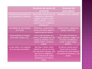 El documento compara las experiencias escolares de estudiantes de primaria y secundaria. Los estudiantes de primaria tenían buenas relaciones con sus compañeros y maestros, y pasaban el tiempo en clase realizando dinámicas y lecturas, mientras que en el recreo jugaban. Los estudiantes de secundaria también se llevaban bien con los demás, y empleaban el tiempo en clase terminando tareas y socializando, además de jugar fútbol en el recreo.