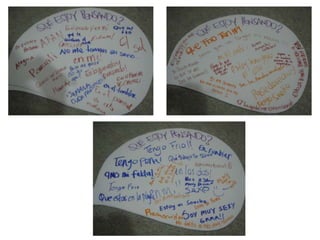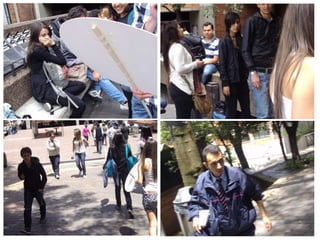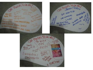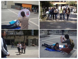 Este documento describe una actividad para definir las percepciones de las personas sobre diferentes tipos de vestimenta y comportamiento a través del uso de tres personajes: un estudiante acostado en el suelo leyendo un libro, un estudiante disfrazado de mimo, y una estudiante vestida para el clima caliente. Los participantes escribirán sus pensamientos y opiniones sobre cada personaje en burbujas de diálogo. El objetivo es examinar la aprobación o desaprobación de lo diferente y concluir que a menudo se discrimina lo diferente y