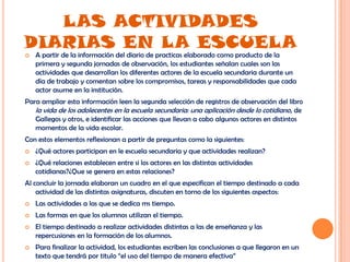 El documento describe las actividades diarias de los diferentes actores en una escuela secundaria, incluyendo maestros, directivos, prefectos y alumnos. Se analizan las relaciones entre los actores y las actividades dentro y fuera del salón de clases, así como el uso del tiempo y el interés y comportamiento de los alumnos.