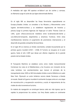 Este documento presenta una introducción al turismo, analizando su evolución histórica desde las primeras manifestaciones en la antigüedad hasta el siglo XX. Resalta hitos como los Juegos Olímpicos griegos, las Cruzadas en la Edad Media, el desarrollo de líneas ferroviarias en el siglo XIX y la primera agencia de viajes fundada por Thomas Cook en 1841. También describe avances en el transporte como barcos más lujosos, ferry boats, car-ferrys y aviones que impulsaron el turismo en el siglo XX