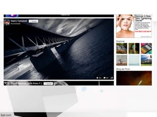 El documento describe varias aplicaciones web como YouTube, Instagram, Flickr, Complexify y Fotolog. YouTube e Instagram permiten publicar, editar y compartir videos y fotos, respectivamente. Flickr también permite compartir fotos de alta calidad. Complexify pertenece a la Web 1.0 y solo muestra enlaces a empresas. El Banco de la República también es parte de la Web 1.0 porque no permite editar su contenido.