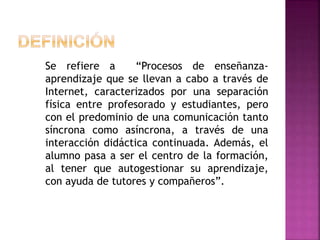 El documento describe el blended learning como una modalidad educativa que combina la enseñanza presencial con el aprendizaje electrónico a través de internet, permitiendo la interacción síncrona y asíncrona entre profesores y estudiantes. Explica las características pedagógicas, organizativas y técnicas del blended learning según Washington en 2008, así como ejemplos de su implementación en Guatemala.