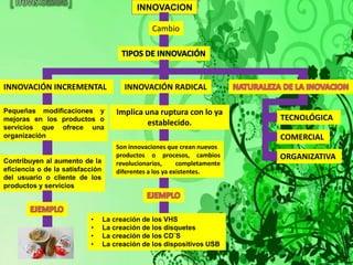 El documento describe los tipos principales de innovación, incluyendo la innovación incremental, que implica pequeñas mejoras, y la innovación radical, que implica cambios revolucionarios. También menciona herramientas como la perseverancia, la originalidad y la responsabilidad, así como conceptos como la flexibilidad, la curiosidad, la imaginación e información que son importantes para la innovación.
