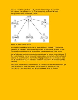 El documento describe diferentes tipos de redes de computadoras, incluyendo LAN (redes de área local), MAN (redes de área metropolitana), y WAN (redes de área amplia), así como topologías de red como malla, estrella, bus, árbol y anillo. Explica que las LAN se usan para comunicación a corta distancia, las WAN para comunicación a larga distancia, y que las MAN conectan varias LAN dentro de una ciudad.