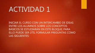 El documento presenta cuatro preguntas clave sobre los conceptos básicos de la educación que se abordarán en el bloque: 1) por qué la educación es un derecho y una obligación, 2) por qué es un servicio público, 3) la relación entre el laicismo y la tolerancia, y 4) la relación entre la gratuidad y el carácter democrático de la educación. Cada pregunta es respondida brevemente en uno o dos párrafos que resumen la relación fundamental.